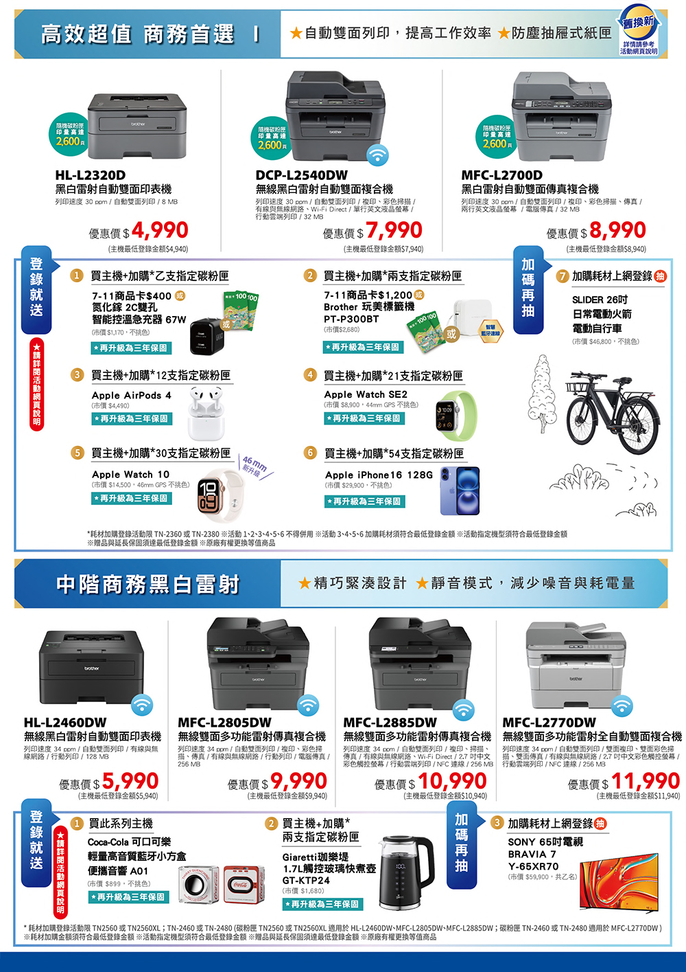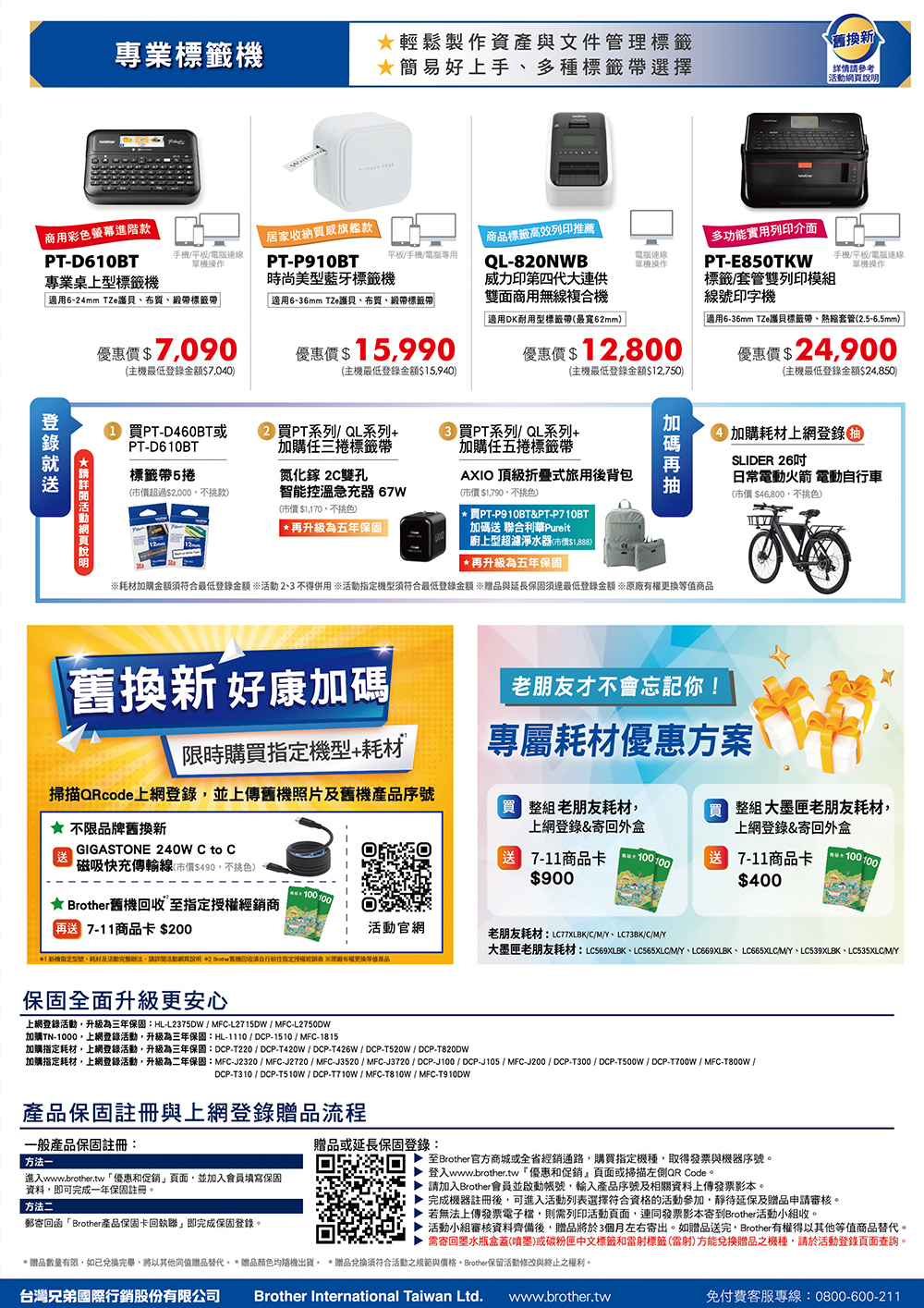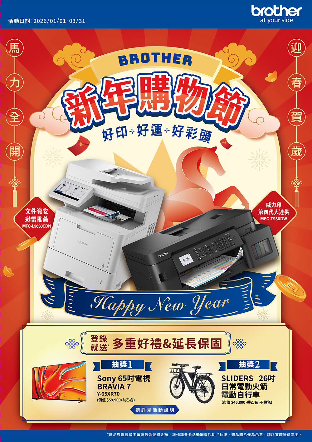 2026/01/01~03/31 brother 提供多項機器及耗材優惠 ,登錄送好禮及延長保固