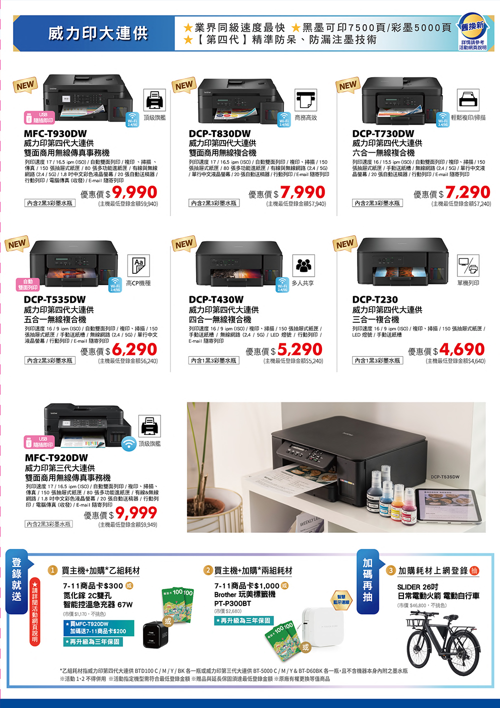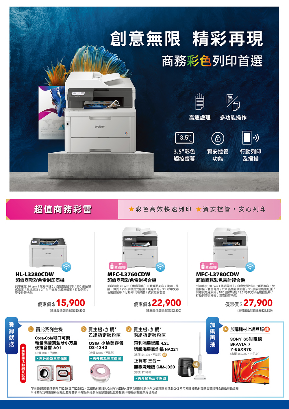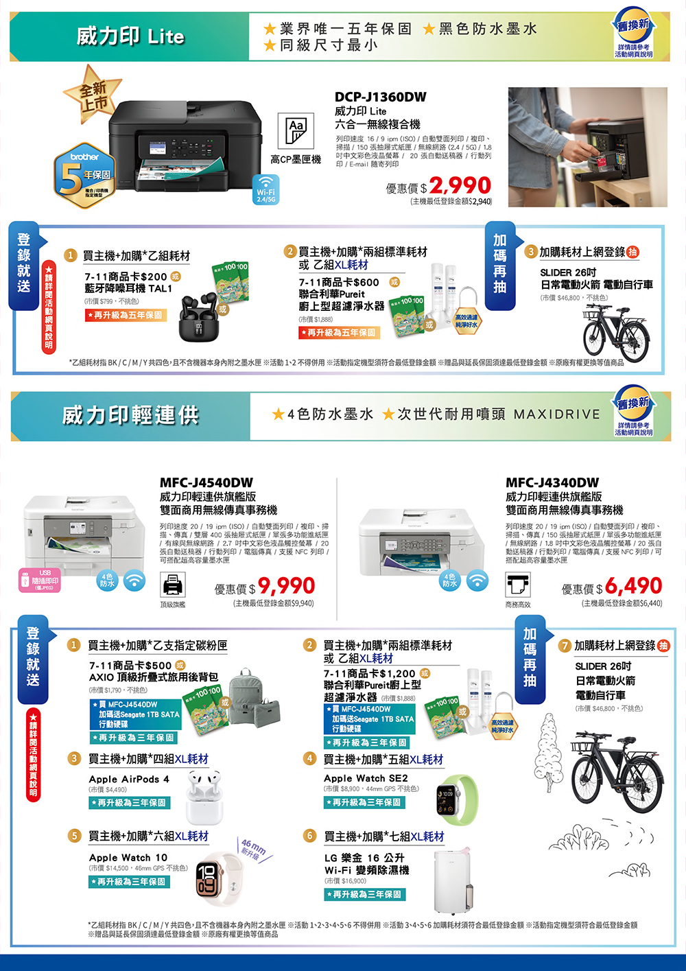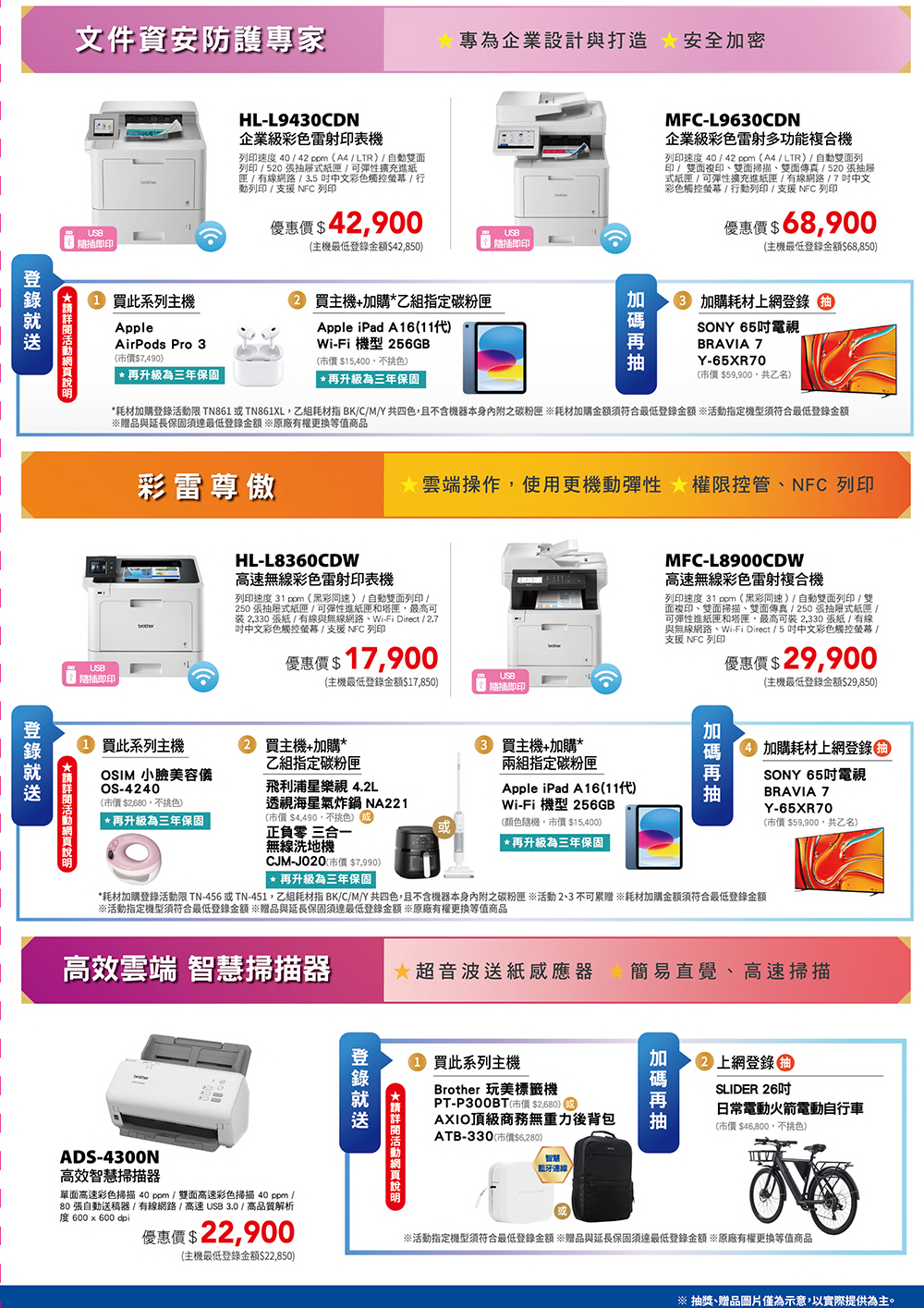 2026/01/01~03/31 brother 提供多項機器及耗材優惠 ,登錄送好禮及延長保固